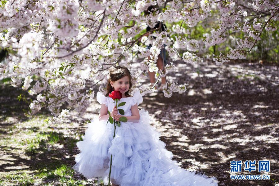 4月16日,一名小女孩在美国纽约中央公园的樱花树下拍照。随着气温回暖,4月的纽约告别了漫长冬季,春花烂漫,生机盎然。 新华社记者韩芳摄