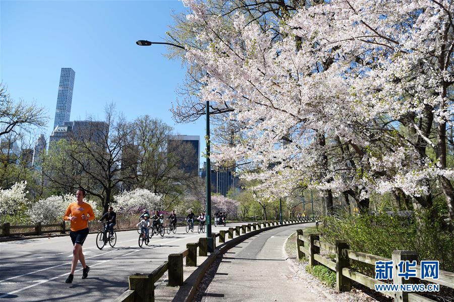 4月16日,人们在美国纽约中央公园慢跑和骑行。随着气温回暖,4月的纽约告别了漫长冬季,春花烂漫,生机盎然。 新华社记者韩芳摄