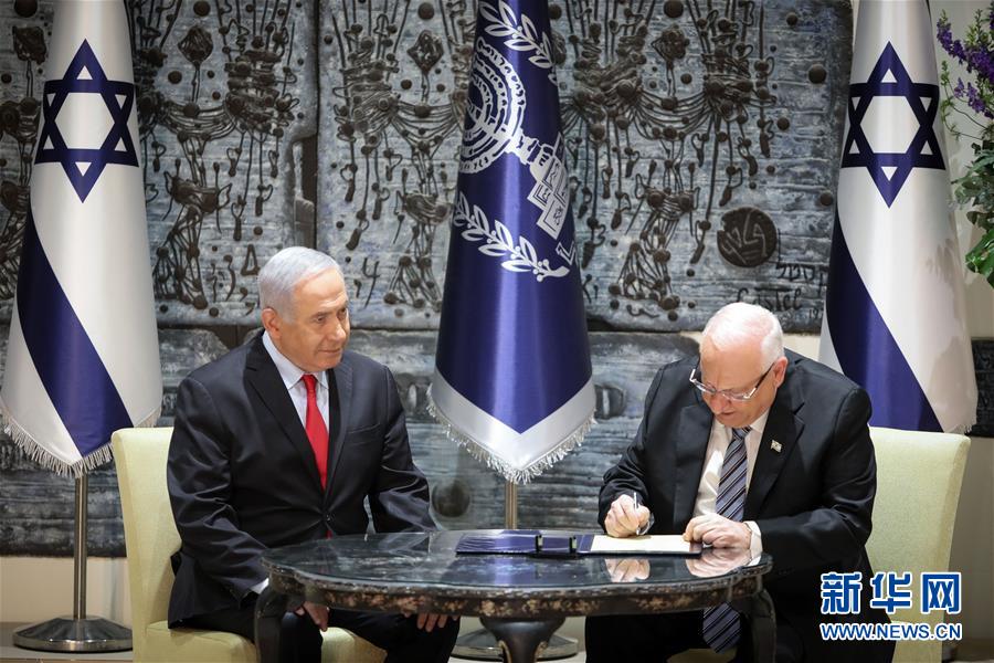 4月17日,以色列总理内塔尼亚胡(左)接受以色列总统里夫林授权。以色列总统里夫林17日晚宣布,正式授权现任总理内塔尼亚胡组建新一届政府。在获得组阁权后,内塔尼亚胡将在不超过42天的期限内完成组阁。 新华社/基尼图片社