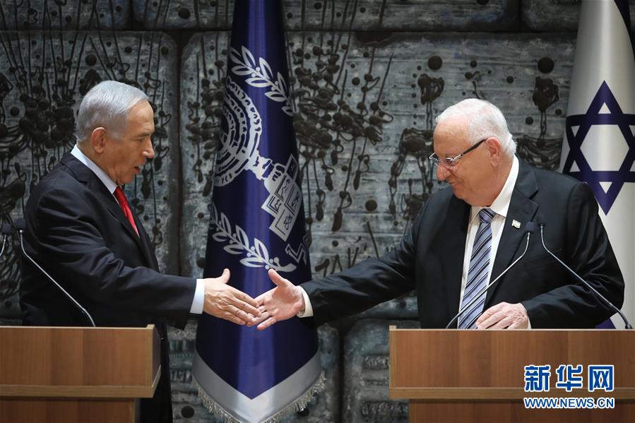 4月17日,以色列总统里夫林(右)在耶路撒冷和总理内塔尼亚胡握手。以色列总统里夫林17日晚宣布,正式授权现任总理内塔尼亚胡组建新一届政府。在获得组阁权后,内塔尼亚胡将在不超过42天的期限内完成组阁。 新华社/基尼图片社
