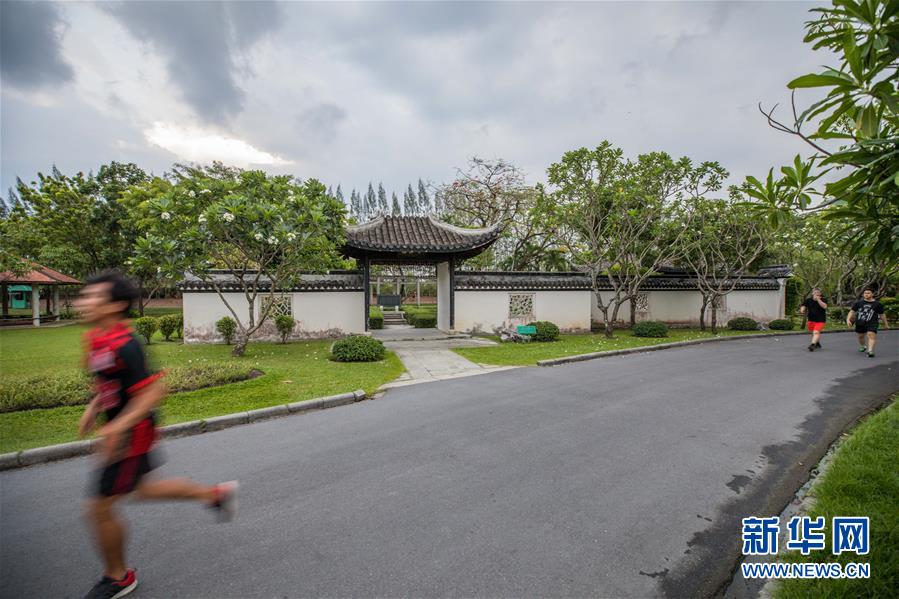 4月3日,锻炼身体的民众经过泰国曼谷九世王御园内的中式园林“智乐园”。 新华社记者 张可任 摄