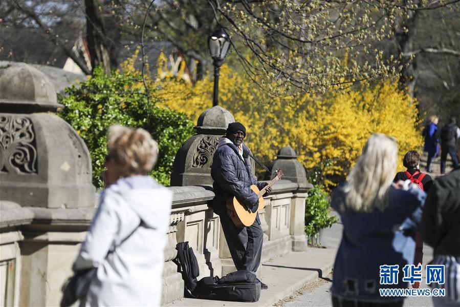 4月16日,一名男子在美国纽约中央公园唱歌。 新华社记者 王迎 摄