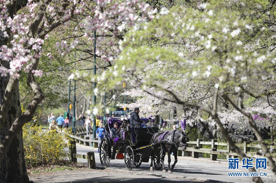 4月16日,人们在美国纽约中央公园乘坐马车游玩。 新华社记者 王迎 摄