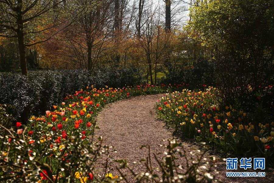 这是4月15日在比利时布鲁塞尔西郊的拜加登城堡拍摄的花丛小径。 新华社记者郑焕松摄
