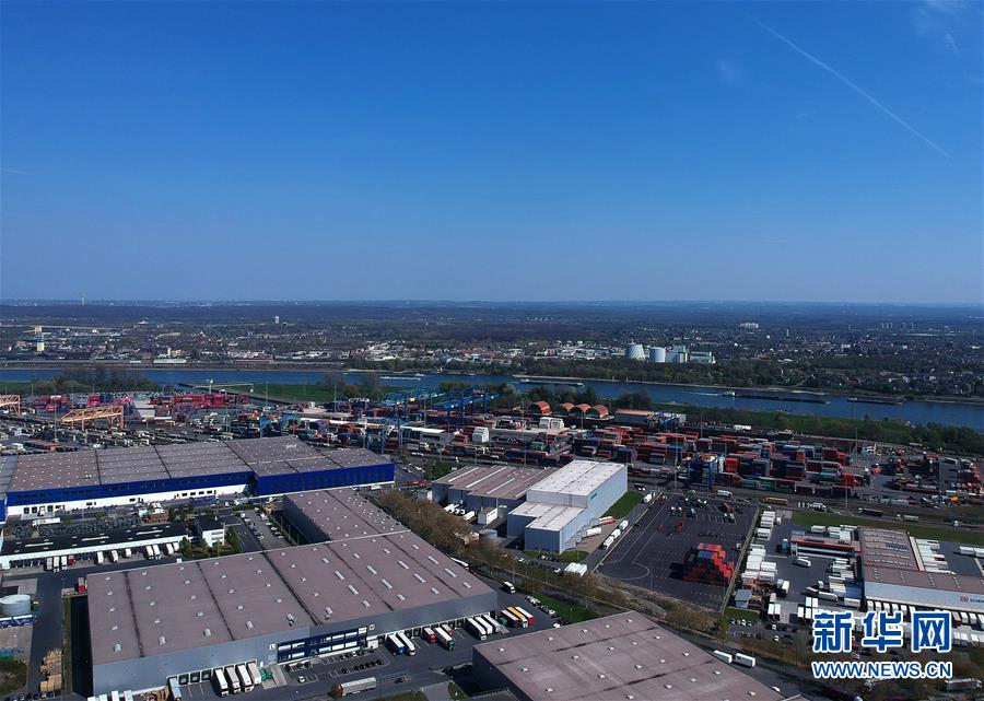 这是4月16日在德国杜伊斯堡拍摄的一处物流园区,远处是杜伊斯堡9个货运场站中最大的DIT场站(无人机拍摄)。DIT场站是中欧班列在欧洲的重要集散地。 新华社记者 逯阳 摄