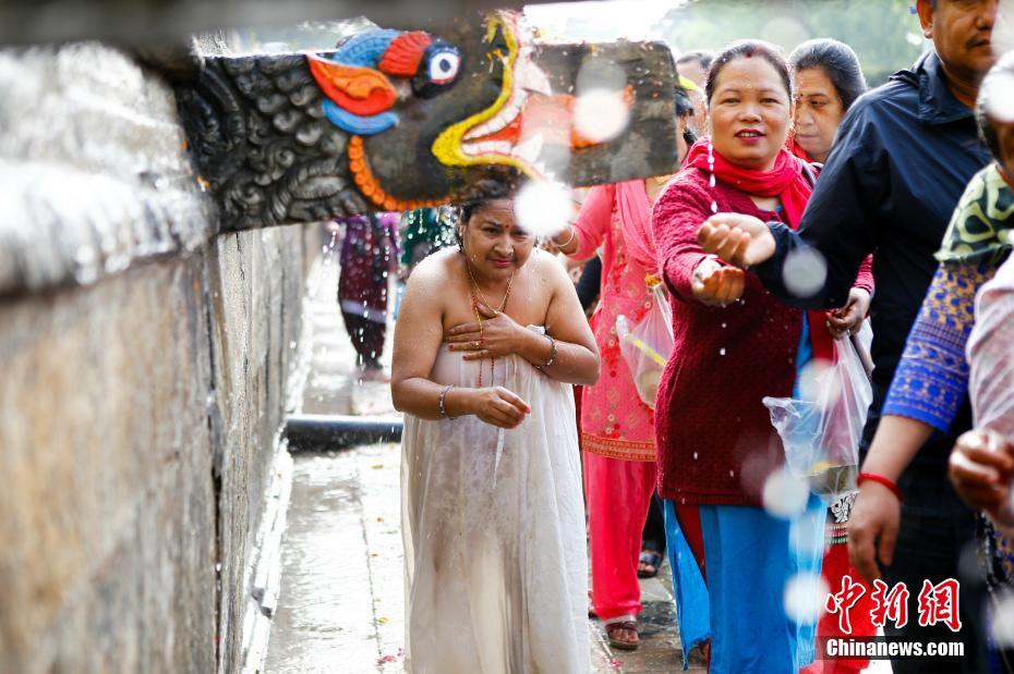 4月19日,尼泊尔印度教信徒在加德满都巴拉珠泉眼(Balaju Baise Dhara)处沐浴,庆祝圣浴节。该处共有纳加琼森林流出的22孔泉水石嘴,信徒认为圣水能够治疗疼痛和皮肤疾病。图为沐浴活动现场。中新社记者 普拉丹 摄