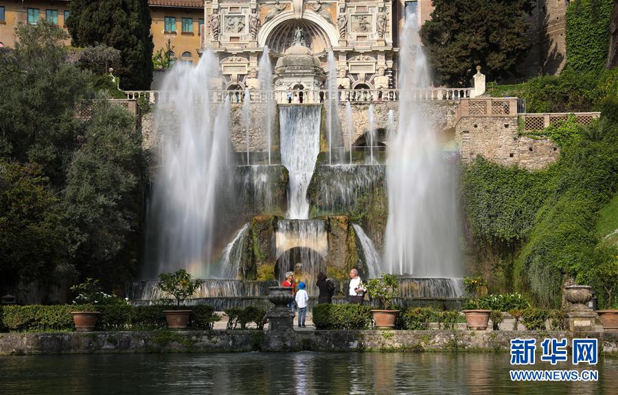 4月17日,在意大利蒂沃利,人们在埃斯特庄园中游览。埃斯特庄园位于意大利蒂沃利,面积约4.5公顷,是文艺复兴时期的文化艺术成果之一。埃斯特庄园是典型的意大利台地园,主建筑物在高地边缘,后面的园林建在陡峭的山坡上。2001年,埃斯特庄园被列入世界文化遗产。2019年中国北京世界园艺博览会(简称北京世园会)将于4月至10月举行。本届世园会将有约110个国家和国际组织、120多个非官方参展方参展,将刷新世园会参展方历史纪录。新华社记者 程婷婷 摄