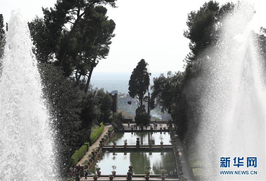 4月17日,在意大利蒂沃利,人们在埃斯特庄园中游览。埃斯特庄园位于意大利蒂沃利,面积约4.5公顷,是文艺复兴时期的文化艺术成果之一。埃斯特庄园是典型的意大利台地园,主建筑物在高地边缘,后面的园林建在陡峭的山坡上。2001年,埃斯特庄园被列入世界文化遗产。2019年中国北京世界园艺博览会(简称北京世园会)将于4月至10月举行。本届世园会将有约110个国家和国际组织、120多个非官方参展方参展,将刷新世园会参展方历史纪录。新华社记者 程婷婷 摄