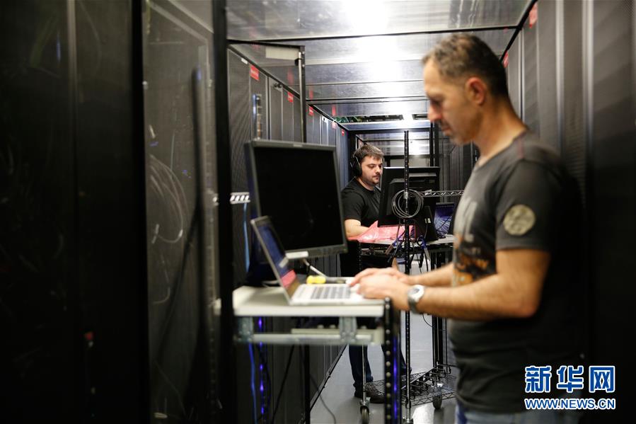 4月17日,在位于以色列北部城市约克尼穆的迈络思公司,技术人员在服务器机房内工作。2019年3月,美国芯片制造商英伟达以69亿美元的价格收购以色列芯片企业迈络思。新华社发(吉尔·科恩·马根 摄)