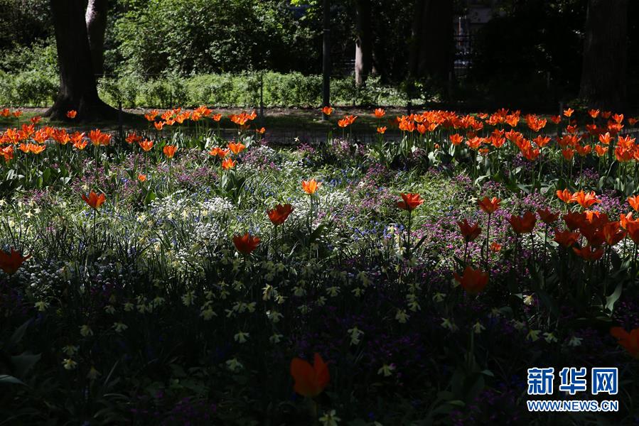 4月19日,比利时布鲁塞尔的五十周年纪念公园内鲜花盛开。