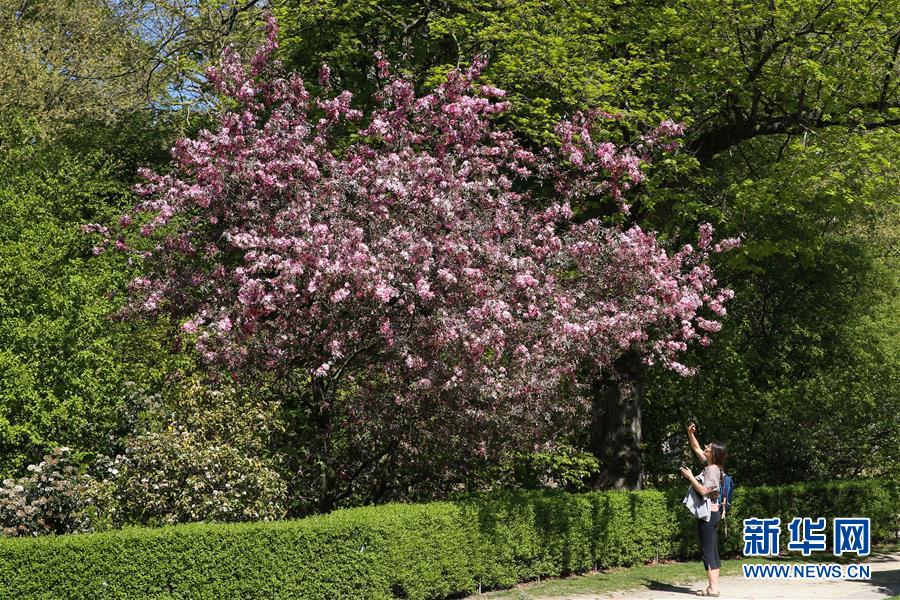 4月19日,一名游客在比利时布鲁塞尔的五十周年纪念公园拍摄花朵。