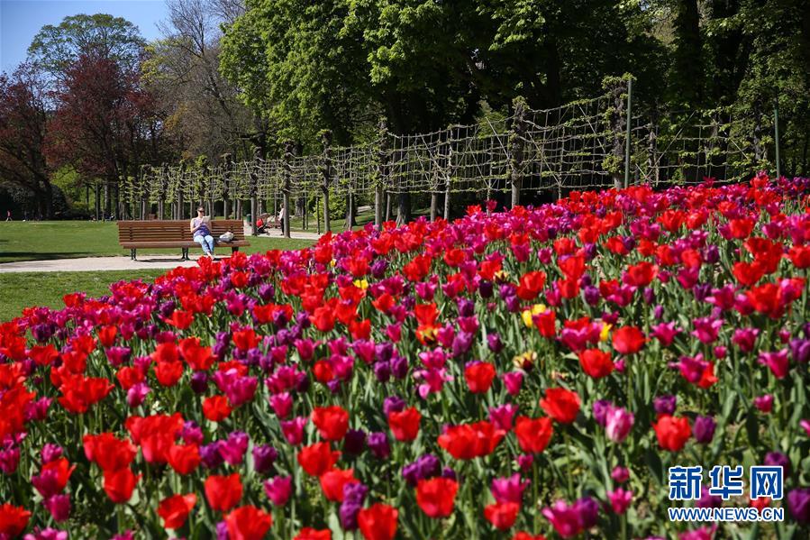 4月19日,一名女子坐在比利时布鲁塞尔五十周年纪念公园的长椅上读书。