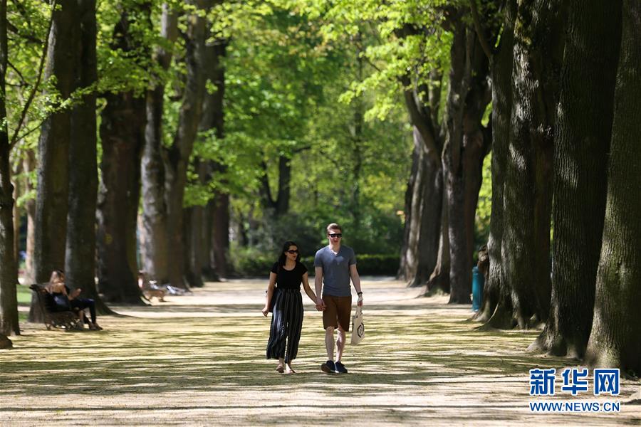 4月19日,人们走在比利时布鲁塞尔五十周年纪念公园的林荫大道上。