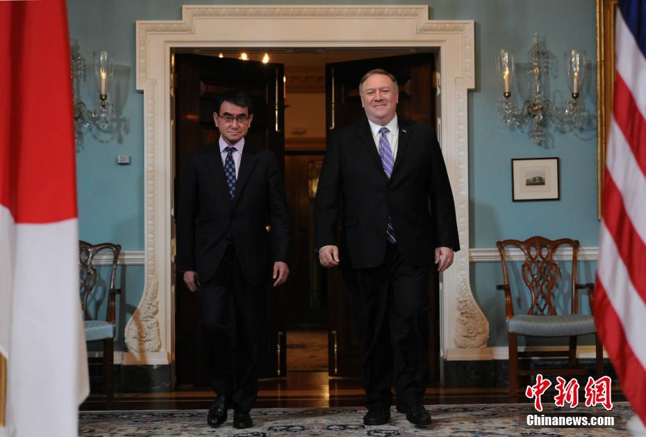 当地时间4月19日,美日安全保障磋商委员会(2+2)会议在华盛顿举行。图为参加会议的美国务卿蓬佩奥与日本外务大臣河野太郎。中新社记者 陈孟统 摄