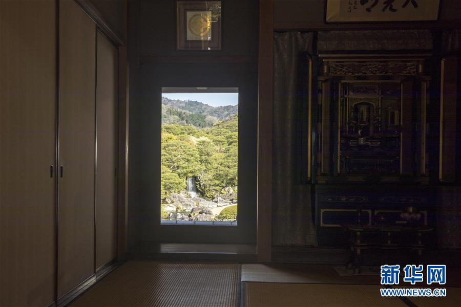 这是4月18日在日本岛根足立美术馆拍摄的“活动的挂轴”。“活动的挂轴”是美术馆日式房间客厅内的一扇窗户,从此处可看到庭院内的流水。 新华社记者 杜潇逸 摄
