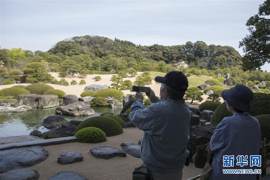 4月18日,在日本岛根足立美术馆,两名参观者拍摄日本庭院风景。新华社记者 杜潇逸 摄