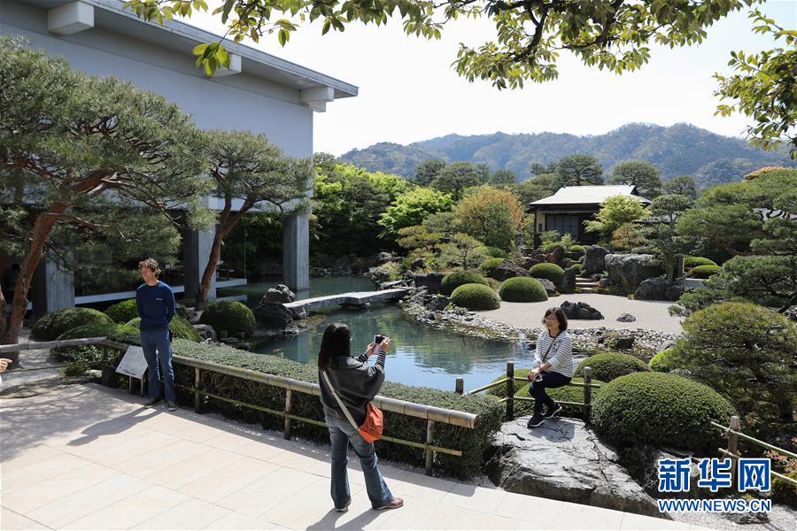 4月18日,在日本岛根足立美术馆,参观者在日本庭院中留影。 新华社记者 杜潇逸 摄