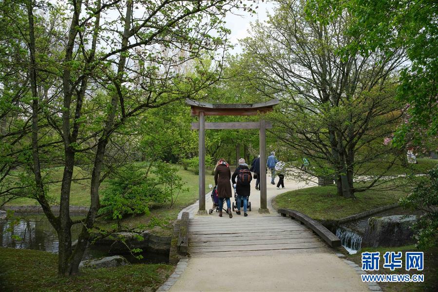 2019年4月14日,游客在比利时哈瑟尔特日本庭园内参观游览。哈瑟尔特日本庭园是一座位于比利时林堡省哈瑟尔特市的日式花园,由哈瑟尔特市的友好城市日本伊丹市于1992年建造。庭园根据17世纪日本茶院的样式设计,面积达2.5公顷。园内种有以樱花为主的多种花卉,日式亭台楼阁点缀其中。新华社记者张铖摄