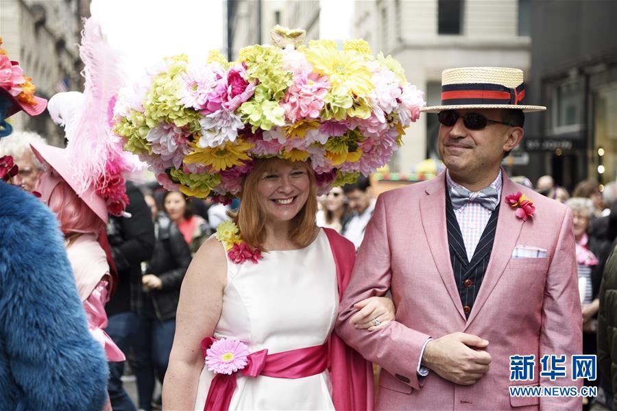 4月21日,在美国纽约,人们盛装参加复活节花帽游行。当日是西方传统节日复活节,人们穿戴色彩缤纷、创意十足的服饰和花帽,在纽约第五大道参加一年一度的花帽游行。 新华社记者 韩芳 摄