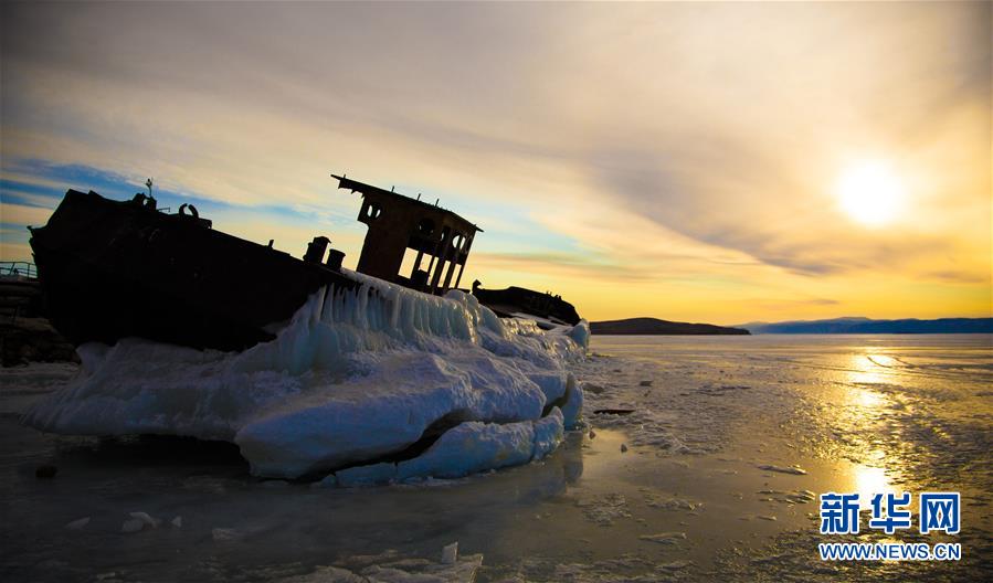 这是2017年3月28日在俄罗斯贝加尔湖奥利洪岛上拍摄的日落时分的废船。 新华社记者张帆摄