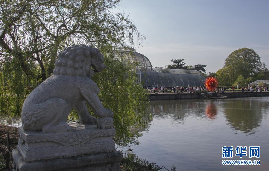 这是4月14日拍摄的英国伦敦邱园(英国皇家植物园)内的石狮与棕榈室。 新华社记者韩岩摄