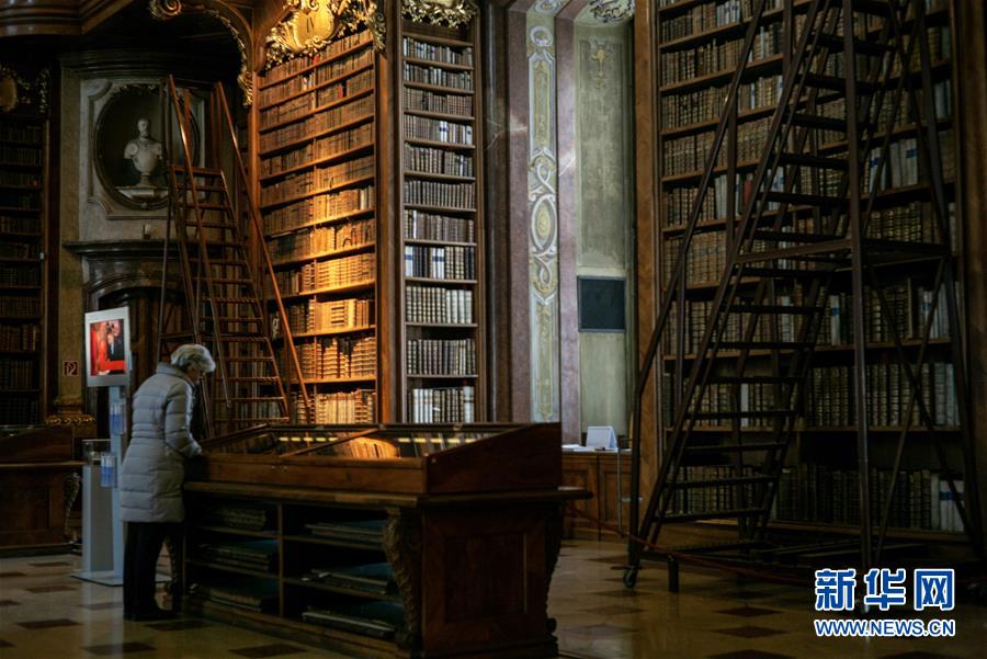4月17日,在奥地利维也纳,一位游客正在奥地利国家图书馆的普隆克厅内参观。