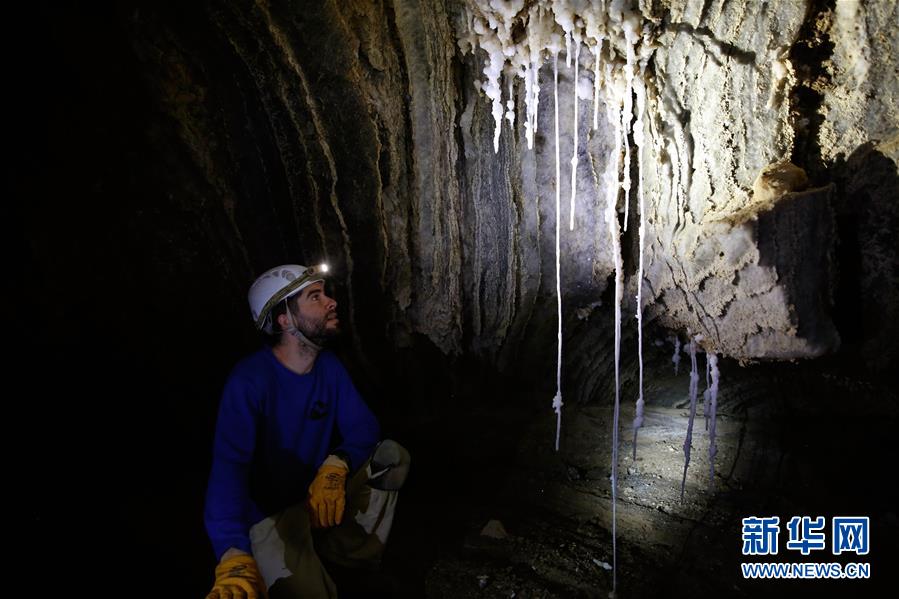 4月14日,在位于死海南端的以色列迈勒海姆盐洞内,来自希伯来大学的博阿兹·朗福德介绍盐洞情况。 以色列洞穴研究专家近日宣布,他们与来自其他国家的洞穴探索者合作勘查发现,位于死海地区的以色列迈勒海姆洞长10公里,是世界上最长的盐洞。这个盐洞最初由以色列希伯来大学洞穴研究中心专家上世纪80年代在绵延11公里的塞多姆山里发现。塞多姆山位于死海西南端,比海平面低170米。山体几乎全部由盐构成,只覆盖薄薄一层岩石。每年冬季,雨水渗入山石缝隙,溶解盐分,不断形成新的洞穴。 新华社发(吉尔·科恩·马根 摄)