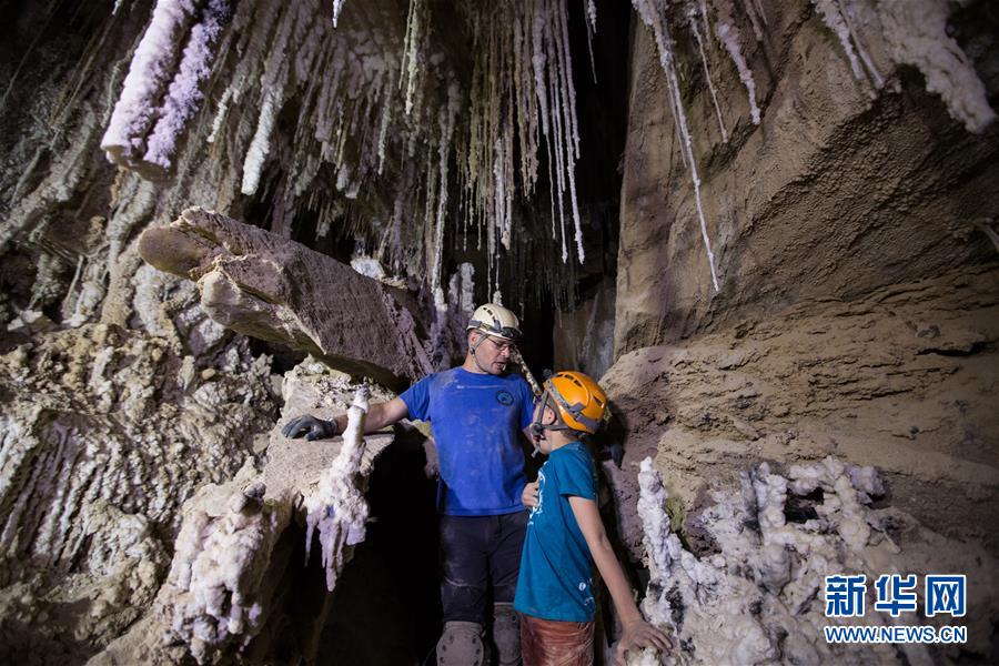 4月14日,在位于死海南端的以色列迈勒海姆盐洞内,来自以色列洞穴探索俱乐部的约阿夫·内盖夫(左)介绍盐洞情况。 以色列洞穴研究专家近日宣布,他们与来自其他国家的洞穴探索者合作勘查发现,位于死海地区的以色列迈勒海姆洞长10公里,是世界上最长的盐洞。这个盐洞最初由以色列希伯来大学洞穴研究中心专家上世纪80年代在绵延11公里的塞多姆山里发现。塞多姆山位于死海西南端,比海平面低170米。山体几乎全部由盐构成,只覆盖薄薄一层岩石。每年冬季,雨水渗入山石缝隙,溶解盐分,不断形成新的洞穴。 新华社记者 郭昱 摄