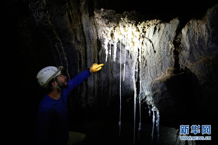 4月14日,在位于死海南端的以色列迈勒海姆盐洞内,来自希伯来大学的博阿兹·朗福德介绍盐洞情况。 以色列洞穴研究专家近日宣布,他们与来自其他国家的洞穴探索者合作勘查发现,位于死海地区的以色列迈勒海姆洞长10公里,是世界上最长的盐洞。这个盐洞最初由以色列希伯来大学洞穴研究中心专家上世纪80年代在绵延11公里的塞多姆山里发现。塞多姆山位于死海西南端,比海平面低170米。山体几乎全部由盐构成,只覆盖薄薄一层岩石。每年冬季,雨水渗入山石缝隙,溶解盐分,不断形成新的洞穴。 新华社发(吉尔·科恩·马根 摄)