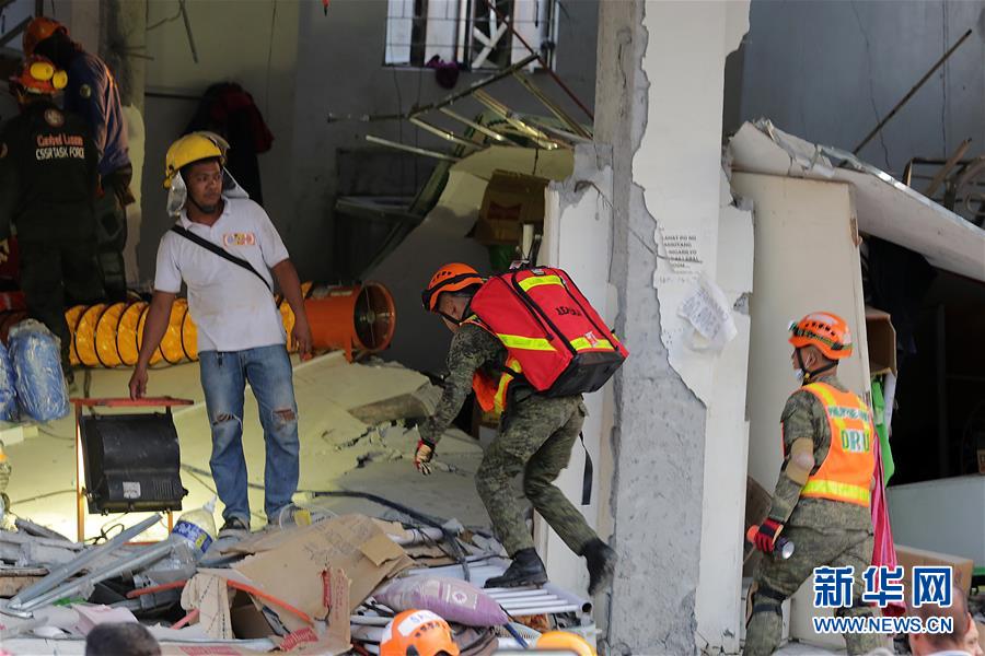 4月23日,在菲律宾邦板牙省,救援人员进行搜救工作。菲律宾北部三描礼士省22日下午发生6.1级地震,截至目前已造成多人死伤,多个城市有建筑物受损。 新华社发(鲁埃勒·乌马利摄)