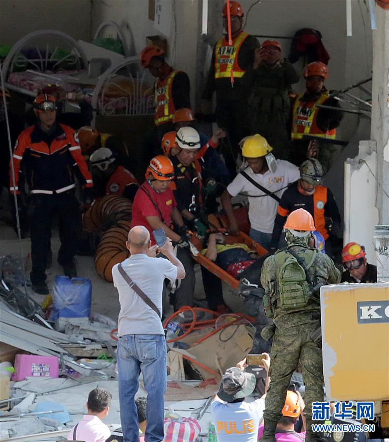 4月23日,在菲律宾邦板牙省,救援人员救出一位幸存者。菲律宾北部三描礼士省22日下午发生6.1级地震,截至目前已造成多人死伤,多个城市有建筑物受损。 新华社发(鲁埃勒·乌马利摄)