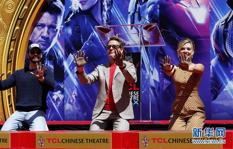 4月23日,在美国洛杉矶好莱坞TCL中国剧院门口,演员小罗伯特·唐尼(中)、斯嘉丽·约翰逊(右)和克里斯·埃文斯参加留印仪式。 当日,《复仇者联盟4:终局之战》部分演员在好莱坞TCL中国剧院门口留下手印。 新华社记者李颖摄