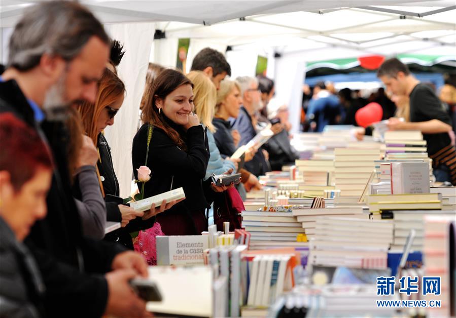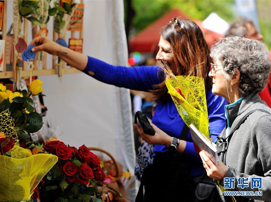 4月23日,在西班牙巴塞罗那,市民挑选圣乔治节纪念品。 23日,西班牙巴塞罗那市中心兰布拉步行大街熙熙攘攘,人们围着一个个临时摊位,有的翻看装帧精美、种类繁多的图书,有的选购火红、嫩黄或洁白的玫瑰。每年的这一天,书籍和玫瑰都会成为绝对的主角,它们是当地人庆祝传统节日圣乔治节必不可少的两样东西。 新华社记者 郭求达 摄