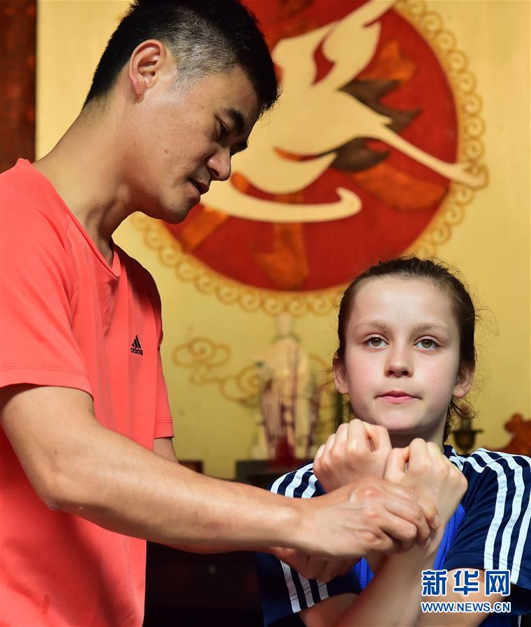 2017年4月20日,在福建永春“翁公祠武术馆”,德国小姑娘路易丝在武术教练潘琼琪的指导下练习白鹤拳的收拳拳势。 受动画电影《功夫熊猫》的影响,路易丝2015年开始跟随父亲克劳斯学习武术,并被深深吸引。 为了圆中国功夫梦,2017年4月,路易丝跟随父亲、哥哥、姐姐以及其他五名德国武术爱好者不远万里,来到福建永春拜师习武。 “虽然语言沟通有困难,但我们全家都热爱永春白鹤拳,我会坚持学下去。”路易丝说。 新华社记者魏培全摄