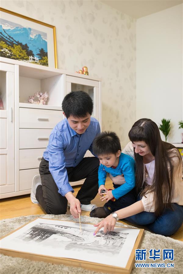 2017年4月18日,在白俄罗斯明斯克,刘哲源和他的妻子克里斯季娜、儿子刘嘉宝华在家里看刘哲源的画作。 刘哲源高中毕业后赴白俄罗斯学习,后与俄罗斯姑娘克里斯季娜在明斯克举行的画展上结缘。如今的夫妻俩已经有了爱情的结晶——刘嘉宝华。 新华社记者 吴壮 摄