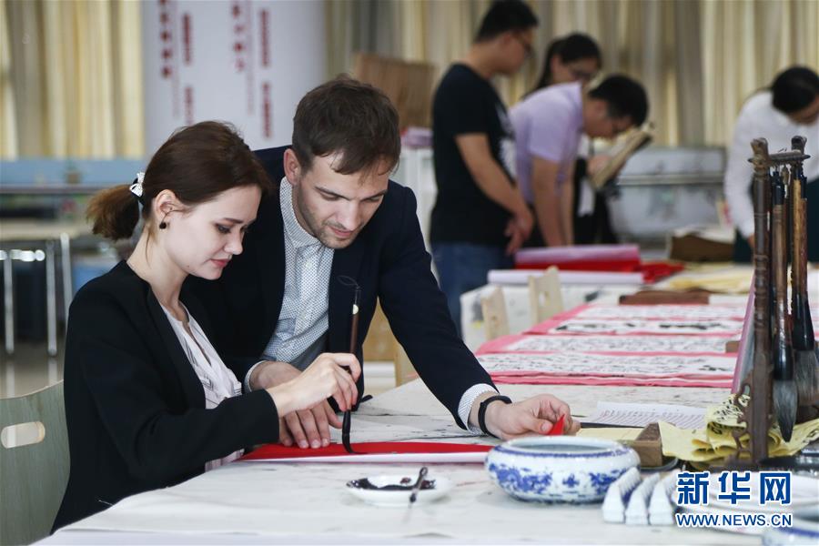 2017年5月12日,在山东省临沂市拓普网络股份有限公司书画院,来自乌克兰的玛丽娜(前左)与男朋友亚历山大一起练习中国书法。二人于2014年来到这里工作。 为积极融入“一带一路”战略,山东省临沂市引进印度、乌克兰、俄罗斯等国人才,开展云计算、大数据、软件技术等研究,这些因项目合作而结缘临沂的外国专家,如今已融入当地展开了自己的幸福生活。 新华社发(尹召功 摄)