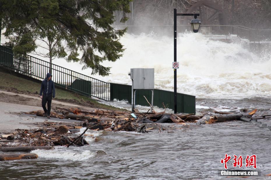 当地时间4月24日,在加拿大多伦多以北大约200公里外的布雷斯布里奇(Bracebridge)镇,春季洪水灾情正愈发严峻,穿城而过的穆斯科卡河水位猛涨。当地市政当局已宣布进入紧急状态。由于近期持续降雨和冰雪融化,加拿大东部安大略省、魁北克省、新不伦瑞克省多地目前正面对洪水挑战。图为当地居民关注水情。中新社记者 余瑞冬 摄