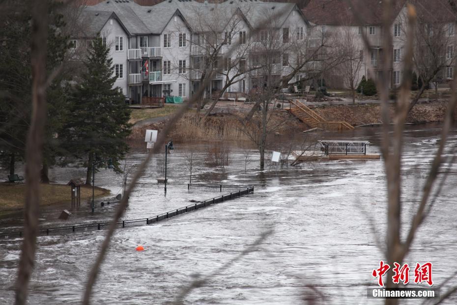 当地时间4月24日,在加拿大多伦多以北大约200公里外的布雷斯布里奇(Bracebridge)镇,春季洪水灾情正愈发严峻,穿城而过的穆斯科卡河水位猛涨。当地市政当局已宣布进入紧急状态。由于近期持续降雨和冰雪融化,加拿大东部安大略省、魁北克省、新不伦瑞克省多地目前正面对洪水挑战。图为河滨小公园已被淹没。中新社记者 余瑞冬 摄