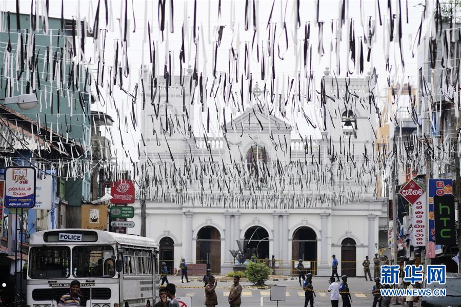 4月26日,在斯里兰卡科伦坡,发生爆炸的圣安东尼教堂外悬挂着寄托哀思的白色和黑色飘带。新华社发(王申摄)