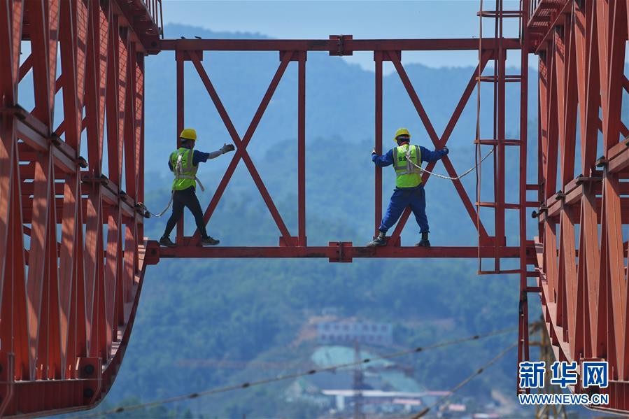 中老铁路施工忙 在位于普洱市的木乃河双线特大桥工程现场,工人钟琪(左)和冯壮在进行架桥机前横联螺丝检查及二次紧固(4月12日摄)。 新华社记者 秦晴 摄