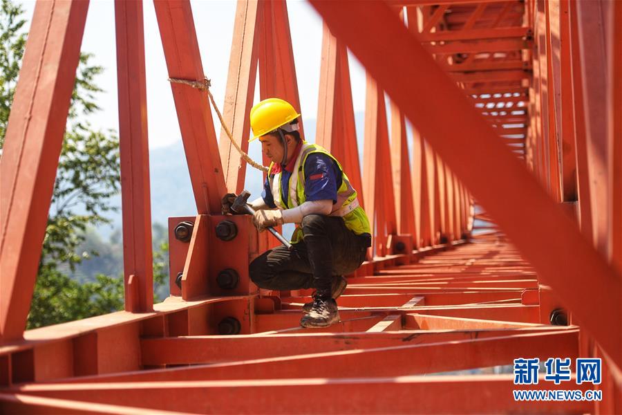 在位于普洱市的木乃河双线特大桥工程现场,工人钟琪在检查螺丝紧固情况(4月12日摄)。新华社记者 秦晴 摄