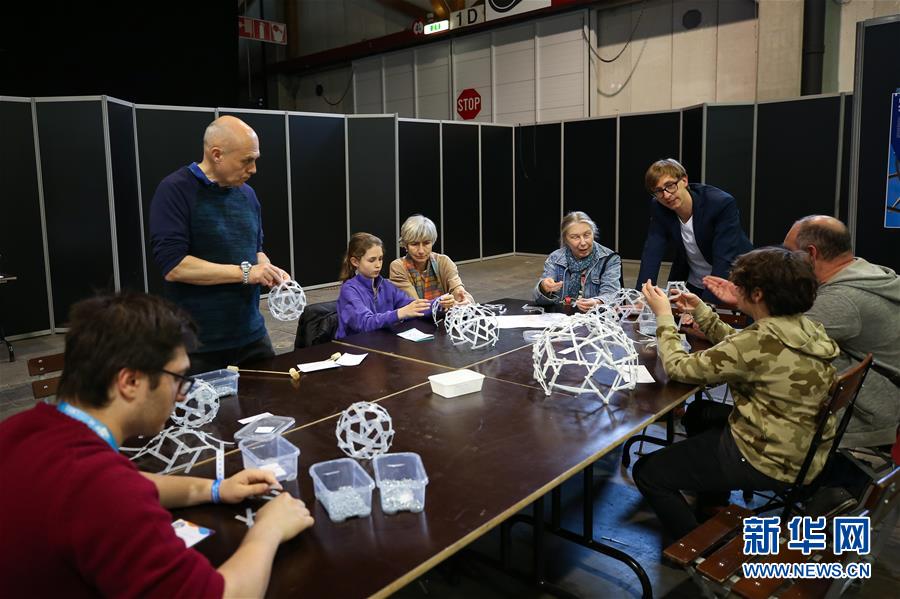 4月27日,在比利时布鲁塞尔,观众在布鲁塞尔科技节上参加建筑结构工作坊。 为期3天的“2019布鲁塞尔科技节”26日在比利时布鲁塞尔开幕。50余家科研机构和高校亮相本次科技节,为观众带来多种互动体验活动。 新华社记者 张铖 摄