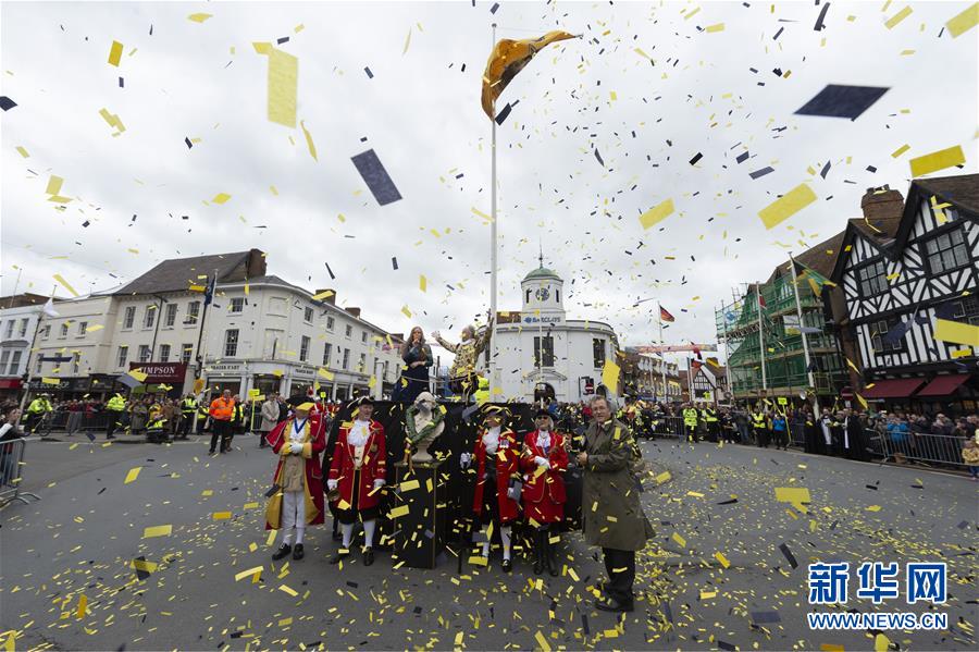 4月27日,人们参加在英国埃文河畔斯特拉特福举行的莎翁诞辰庆典游行。当日,人们在莎士比亚出生地英国埃文河畔斯特拉特福小镇举行活动,纪念这位文学巨匠诞辰455周年。 新华社发(雷伊·唐摄)