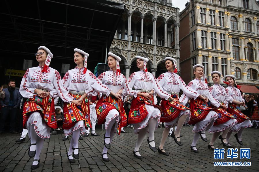 4月28日,在比利时布鲁塞尔大广场,演员表演保加利亚的民族舞蹈。 当日,来自欧洲多个国家的表演者在比利时布鲁塞尔大广场载歌载舞,庆祝为期五天的2019年巴尔干文化艺术节圆满落幕。该文化艺术节旨在用音乐、舞蹈、文学、街头艺术等方式向公众展现东南欧巴尔干半岛地区的民族文化风情。 新华社记者郑焕松摄