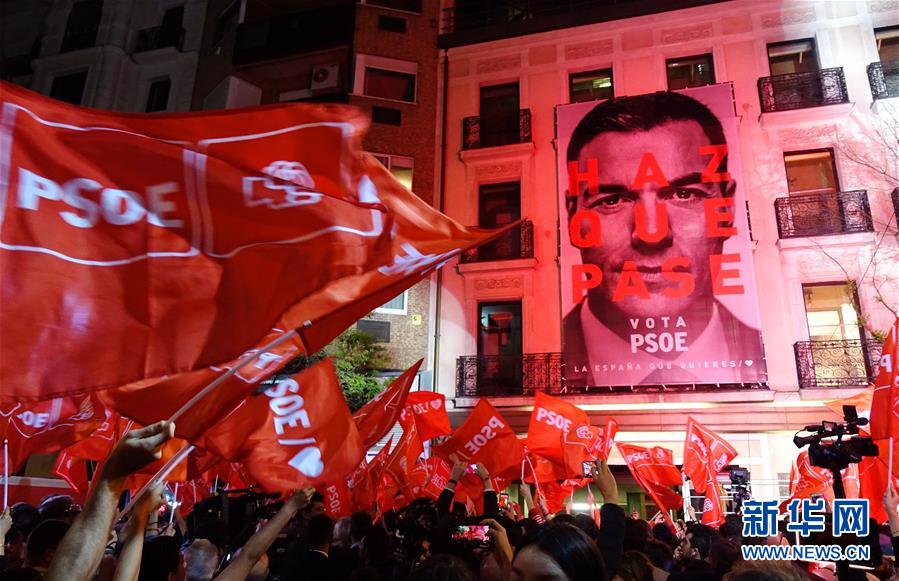 4月28日,在西班牙首都马德里,工人社会党的支持者在该党总部庆祝。 西班牙议会选举投票28日晚结束。根据西班牙内政部公布的初步计票结果,执政的中左翼政党工人社会党得票率第一。因未能在议会取得绝对多数席位,工人社会党需与其他党派协商以期联合执政。 新华社记者 郭求达 摄
