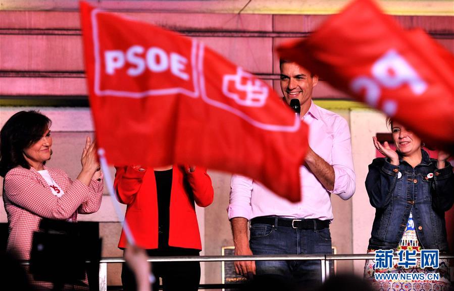 4月28日,在西班牙首都马德里,西班牙首相、工人社会党主席桑切斯(右二)在选举结果揭晓后与支持者见面。 西班牙议会选举投票28日晚结束。根据西班牙内政部公布的初步计票结果,执政的中左翼政党工人社会党得票率第一。因未能在议会取得绝对多数席位,工人社会党需与其他党派协商以期联合执政。 新华社记者 郭求达 摄