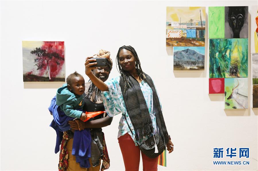 4月29日,在津巴布韦首都哈拉雷的国家艺术馆,观众与艺术作品自拍合影。 第二届“一带一路”非中艺术交流展29日在津巴布韦首都哈拉雷的国家艺术馆拉开帷幕,展出来自10多个非洲国家和中国的艺术家创作的120多幅作品。 新华社发(陈雅琴摄)