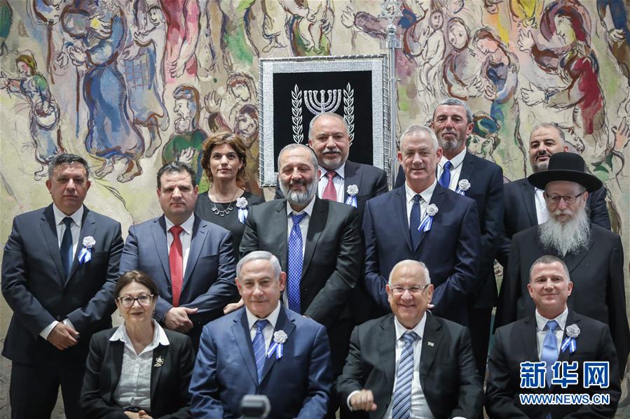 4月30日,在耶路撒冷的以色列议会大厦,以色列总理内塔尼亚胡(前左二)参加以色列新当选的第21届议会议员宣誓就职典礼。 当日,以色列新当选的第21届议会议员在耶路撒冷的议会大厦宣誓就职。 新华社/基尼图片社