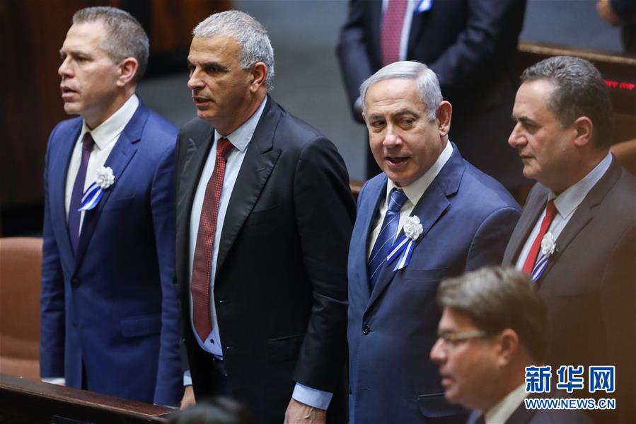 4月30日,在耶路撒冷的以色列议会大厦,以色列总理内塔尼亚胡(左三)参加以色列新当选的第21届议会议员宣誓就职典礼。 当日,以色列新当选的第21届议会议员在耶路撒冷的议会大厦宣誓就职。 新华社/基尼图片社