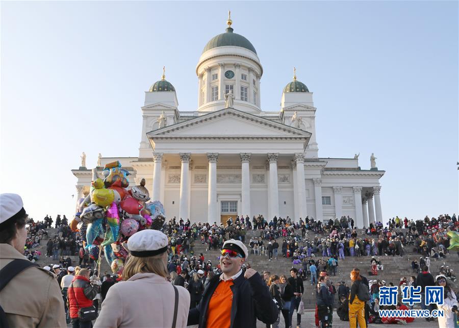 4月30日,在芬兰首都赫尔辛基市中心的参议院广场,人们头戴学生帽欢庆。 当日,赫尔辛基举行一年一度的戴帽仪式,人们在吊车的帮助下为市中心圆形水池内的少女阿曼达塑像戴上帽子,并聚集在塑像周围尽情狂欢。 新华社记者李骥志摄